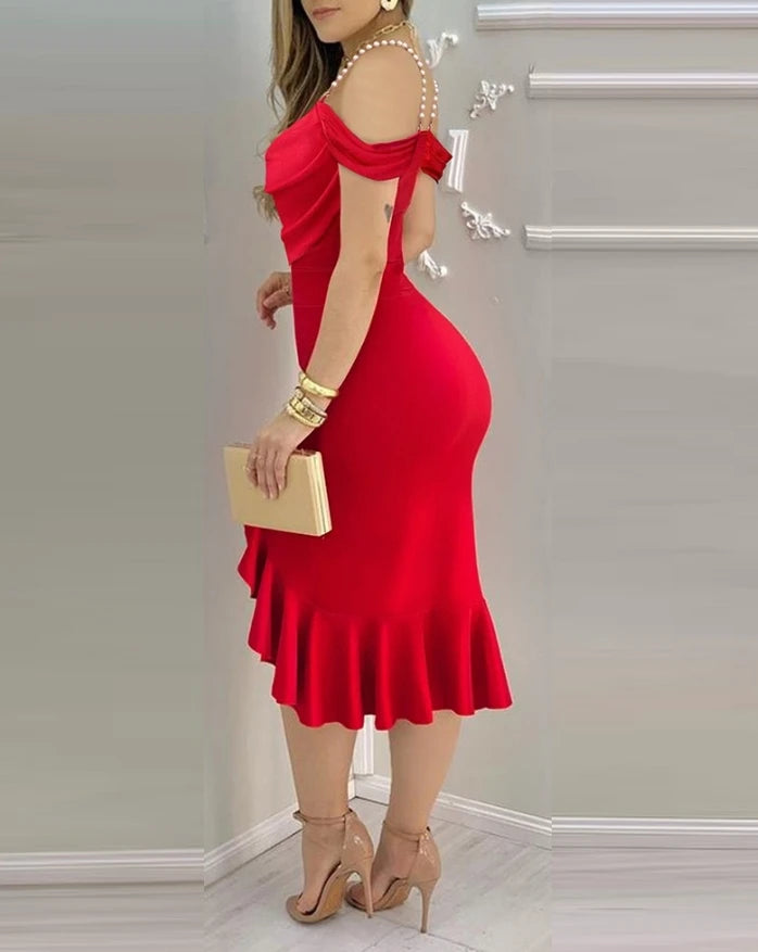 Women's Casual Fake Two Piece Cowl Neck Pearls Strap Bodycon Dress Temperament Wedding Guest Sexy Beauty Skinny Party Dresses